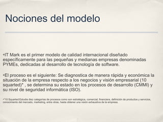 IT Mark es un modelo de calidad internacional diseñado para pymes del sector tecnológico, que permite diagnosticar y mejorar sus procesos de desarrollo y seguridad informática. A través de un plan de acción basado en el diagnóstico, las empresas pueden alcanzar una certificación reconocida, mejorando su desempeño y competitividad en el mercado. IT Mark ofrece tres niveles de acreditación, permitiendo un camino de mejora continua y visibilidad sobre las capacidades y debilidades de cada organización.