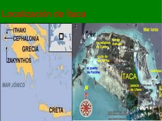 Ítaca es una isla griega en el mar Jónico con una superficie de 96 km2 y 3.084 habitantes. Según la mitología griega, fue fundada por Ítacos y es el hogar de Odiseo, rey de Ítaca. Odiseo describe Ítaca como "hermosa al atardecer" con un monte cubierto de árboles y cercana a otras islas. Los lugares más visitados incluyen iglesias, un museo arqueológico y el monasterio de la Virgen Kathariotissa, protector