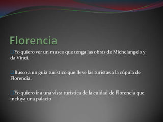 El documento lista varias actividades turísticas y opciones de alojamiento en Florencia, Venecia y Roma. En Florencia se puede subir a la cúpula, visitar los jardines Boboli y alojarse en el Hotel Caravaggio. En Venecia se puede ir a la playa, navegar por el Gran Canal y alojarse en el Hotel de la Playa. En Roma se puede visitar el Panteón, el Coliseo y alojarse en el Hotel Raffaello.