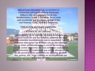 Italia se encuentra en la península itálica y cuenta con dos grandes islas, Sicilia y Cerdeña. Tiene una población de más de 60 millones de habitantes y una superficie de 301,338 km2. La gastronomía italiana se caracteriza por la pasta y el vino, y las tradiciones incluyen el Carnaval de Venecia y la danza tarantella. Algunos de los principales lugares turísticos son la Basílica de San Pedro y el Coliseo en Roma, y la ciudad de Venecia con sus canales y pu