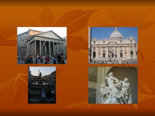 El documento proporciona una guía de 3 días para visitar Roma, incluyendo lugares emblemáticos como la Fontana de Trevi, el Coliseo, los Foros Romanos y el Palatino. También recomienda visitar el Vaticano, que requiere entre 3 a 4 horas, así como museos como los Museos Capitolinos, que requieren entre 2 a 3 horas. Además, brinda información sobre lugares destacados en Florencia y Venecia.