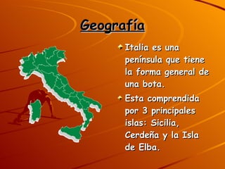 Italia es una península en forma de bota que incluye las islas de Sicilia, Cerdeña e Isla de Elba. Entre sus principales monumentos se encuentran el Coliseo de Roma, reconocido como una de las Nuevas Siete Maravillas del Mundo Moderno, y la Torre Inclinada de Pisa con sus 294 escalones internos en espiral. Los platos típicos italianos incluyen los ravioles y lasañas, cuya receta varía según la región, y que según la tradición fueron introducidos por Marco