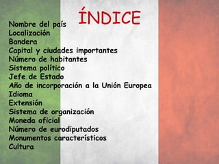 Italia, ubicada en el sur de Europa y con una población de aproximadamente 59.394.207 habitantes, es una república democrática desde 1946 y uno de los países fundadores de la Unión Europea. Su capital es Roma, famosa por monumentos como el Coliseo y la Basílica de San Pedro, y su idioma oficial es el italiano. La cultura italiana es reconocida mundialmente, destacándose por su gastronomía, festivales como el Carnaval de Venecia, y su tradicional vestimenta inspirada en el Renacimiento.