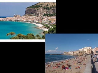 Italia es un país del sur de Europa conocido como la bota por su forma de península. El documento describe varios sitios turísticos notables de Italia como la Fuente de Neptuno en Florencia, el Arco de Trajano en Benevento, el Castillo de San Pietro en Verona, el Castillo Sant'Angelo en Roma y la playa de Cefalú en Sicilia. También describe la monumental Escalera de los Museos Vaticanos diseñada por Donato Bramante.