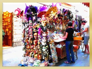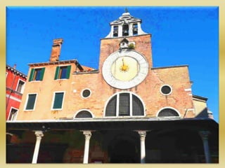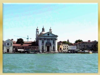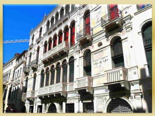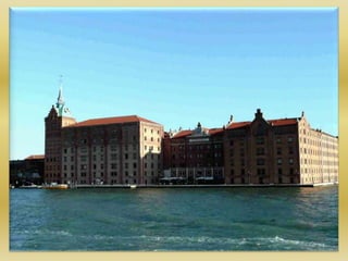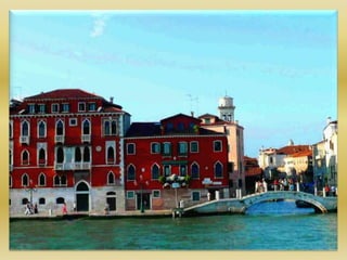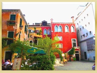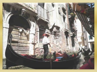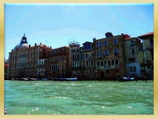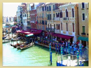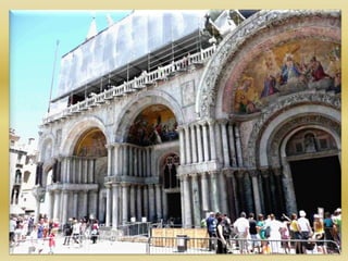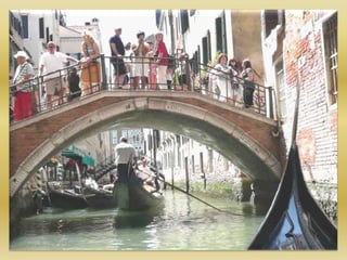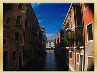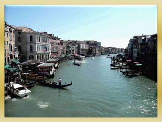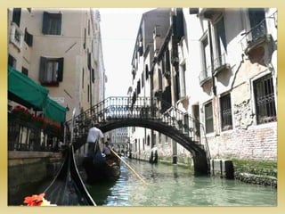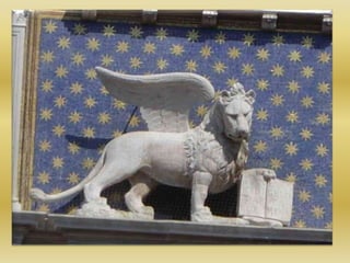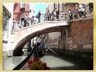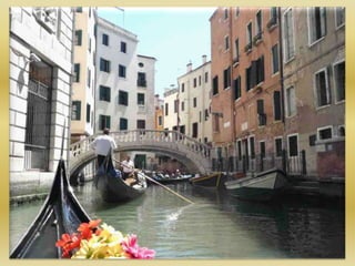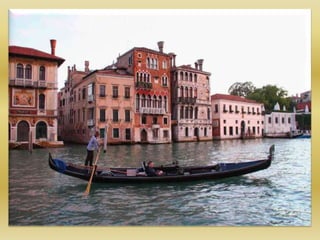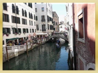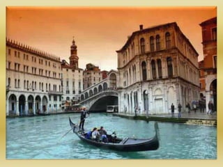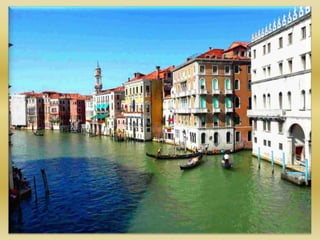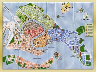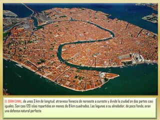 Venecia está compuesta por 118 islas unidas por puentes sobre canales. La ciudad se divide en dos partes por el Gran Canal. Los símbolos de Venecia son el León de San Marcos y la Basílica de San Marcos, ubicada en la Plaza de San Marcos junto al Campanario y el Palacio Ducal. Venecia alcanzó su apogeo en los siglos XV-XVI como potencia comercial y artística.