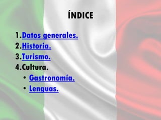 Italia es una república soberana miembro de la Unión Europea ubicada en Europa. Fue el hogar de importantes civilizaciones como los etruscos, griegos y romanos, y fue cuna del Renacimiento. Actualmente, Roma es su capital y el italiano su idioma oficial. El turismo es una importante industria, atrayendo a millones de visitantes cada año a sitios como Roma, Venecia y Florencia para admirar su rica herencia cultural y artística.