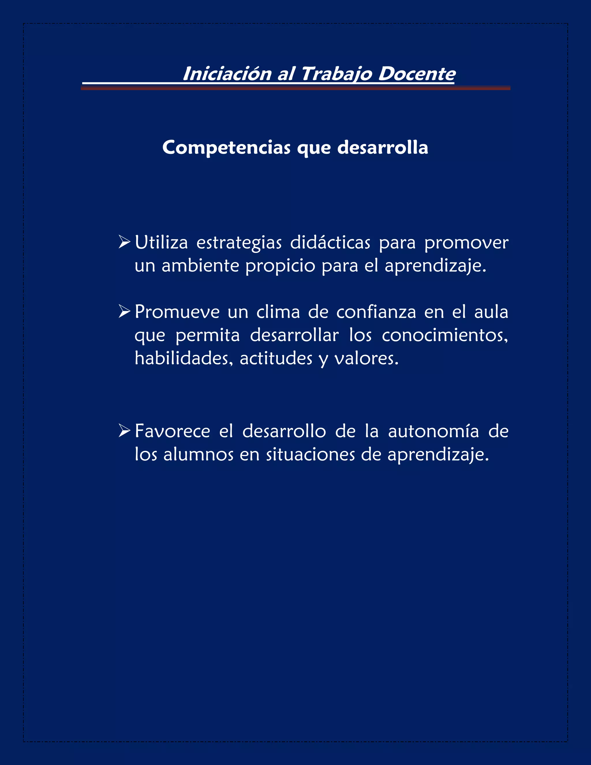 Las competencias que desarrolla la iniciación al trabajo docente incluyen utilizar estrategias didácticas para promover un ambiente de aprendizaje positivo, fomentar un clima de confianza en el aula que permita desarrollar conocimientos y habilidades, y favorecer la autonomía de los estudiantes.