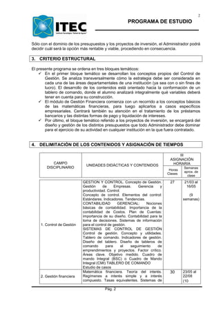 El documento presenta el programa de estudio para la asignatura de Control de Gestión y Gestión Financiera. El programa se divide en tres bloques temáticos: 1) Control de Gestión, 2) Gestión Financiera, y 3) Proyectos de Inversión. El objetivo es que los estudiantes adquieran las herramientas necesarias para desempeñarse como administradores, incluyendo el desarrollo de indicadores de gestión, análisis financiero, y presupuestación de proyectos de inversión. El programa también describe las actividades, tareas