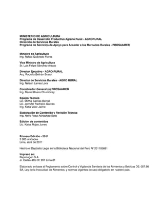 Este documento presenta las Buenas Prácticas de Manufactura (BPM) para productores rurales dedicados al procesamiento de alimentos. Explica brevemente qué son las BPM, por qué deben implementarse y cuáles son los principios básicos. Además, resume el marco normativo nacional e internacional relacionado a las BPM y la inocuidad de los alimentos. El objetivo del documento es fortalecer a los agroindustriales rurales para que produzcan alimentos inocuos y competitivos que satisfagan las exigencias del mercado.