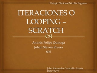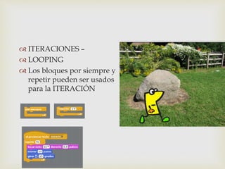 El documento describe dos problemas de programación que involucran la iteración y el movimiento de objetos. El primer problema implica mover un objeto de derecha a izquierda en el escenario mientras parece preocupado. El segundo problema involucra hacer mover un objeto pero no proporciona más detalles.