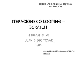 Este documento describe cómo usar los bloques "por siempre" y "se repite" en Scratch para iterar o buclear acciones como mover un objeto, tocar una nota musical o girar. Explica cómo hacer que un objeto se mueva continuamente de derecha a izquierda o persiga el puntero del mouse usando iteraciones. También cubre cómo controlar un objeto con las flechas del teclado para moverlo en las cuatro direcciones.