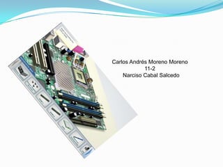 El documento describe los pasos para instalar componentes de una computadora, incluyendo asegurar la tarjeta madre, los módulos de memoria RAM, la unidad central de procesamiento y el ventilador a la placa base, y luego conectarlos.