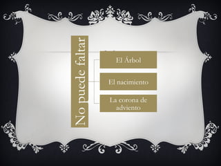 El documento resume la historia y tradiciones de la Navidad. Celebra el nacimiento de Jesucristo el 25 de diciembre y es una de las fiestas más importantes del cristianismo. A través de los siglos se han ido añadiendo tradiciones como los nacimientos, villancicos, el árbol y postales de Navidad, y en la actualidad se centra en el intercambio de regalos y reuniones familiares, aunque lo más importante es pasar tiempo de calidad en familia.