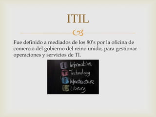 ITIL fue definido en los 80 por el gobierno del Reino Unido para gestionar operaciones y servicios TI. Su función principal es alinear los negocios y la tecnología para valorar lo más importante. El PMBOK fue publicado en 1987 por el PMI para documentar y estandarizar las mejores prácticas en gestión de proyectos aplicables a una amplia gama de industrias. Define procesos, herramientas, técnicas e informes para cada proceso de gestión de proyectos.