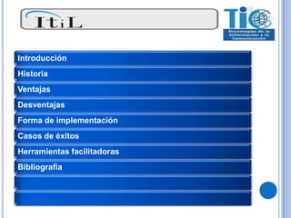 Este documento describe la metodología ITIL (Biblioteca de Infraestructura de Tecnologías de la Información), incluyendo su historia, ventajas, desventajas y forma de implementación. ITIL es una colección de mejores prácticas para la gestión de servicios de TI que tiene como objetivo alinear a las empresas con dicha gestión y lograr la mejora continua a través de procesos monitoreados. El documento también cubre casos de éxito de ITIL y herramientas facilitadoras.