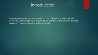 El documento presenta cómo ITIL contribuye al desarrollo y mejora de los servicios en proyectos informáticos, destacando su beneficio en áreas como soporte, seguridad, y auditoría. Se enfatiza que ITIL maximiza la calidad del servicio, mejora la satisfacción laboral y alinea la TI con los objetivos del negocio. En conclusión, ITIL es una herramienta efectiva para gestionar estándares y mejorar la eficiencia de los servicios informáticos.