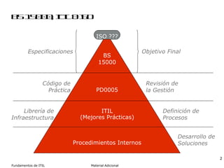 El documento describe los diferentes procesos involucrados en la gestión de servicios de TI, incluyendo la gestión de incidentes, problemas, cambios, configuraciones, servicios, nivel de servicio y seguridad. Explica los roles y responsabilidades en la gestión de configuraciones y diagramas para representar las relaciones entre componentes de infraestructura.