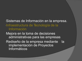 El documento describe los componentes clave de la infraestructura de tecnología de la información de una empresa. Explica que la infraestructura incluye plataformas de hardware, sistemas operativos, aplicaciones de software empresarial, bases de datos, almacenamiento de datos, redes y conectividad. Además, analiza los principales proveedores de cada uno de estos componentes y cómo han evolucionado gracias a factores tecnológicos como la ley de Moore y el crecimiento de Internet.