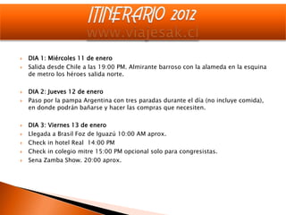Este itinerario describe un viaje de 18 días a Brasil y Argentina entre el 11 de enero y el 28 de enero de 2012. Incluye visitas a las Cataratas de Iguazú, la Laguna de la Concepción, varias playas en Florianópolis y Camboriu, y la isla Campeche, además de tres días en un congreso en Iguazú. El viaje comienza en Chile y termina de regreso en Chile después de recorrer varios lugares en Brasil, Argentina y Uruguay.