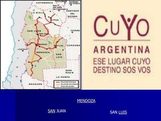 Este documento presenta un itinerario de 10 días para un viaje de estudios a las provincias de San Luis, Mendoza y San Juan en la región de Cuyo. Incluye detalles sobre los hospedajes, recorridos turísticos planeados, actividades y lugares a visitar en cada ciudad y provincia. El costo total del viaje es de $3000 por persona e incluye transporte, hoteles con pensión completa y asistencia médica.