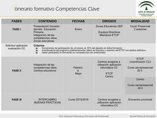 Este documento describe un plan de formación en tres fases para integrar las competencias clave en el ámbito educativo. La Fase I presenta el borrador del decreto a coordinadores y directores en enero. La Fase II ofrece formación a los centros seleccionados de febrero a mayo sobre metodologías y evaluación de competencias. La Fase III incluye un intercambio de buenas prácticas.
