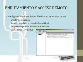 Este documento resume los conceptos clave de enrutamiento y acceso remoto en Windows Server 2003. Explica cómo configurar el enrutamiento, incluidos los protocolos RIP y OSPF, así como NAT y filtros de paquetes. También cubre la configuración de acceso remoto, autenticación, autorización y políticas de acceso remoto usando RRAS e IAS.