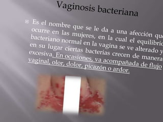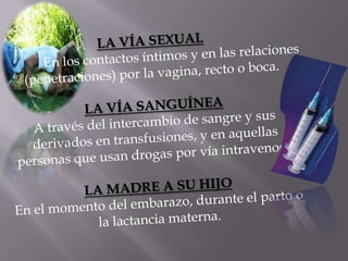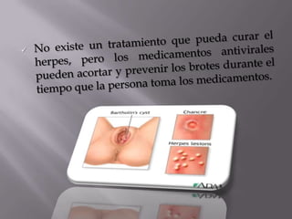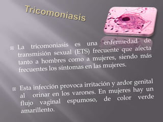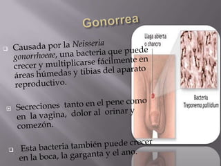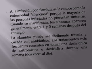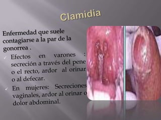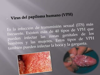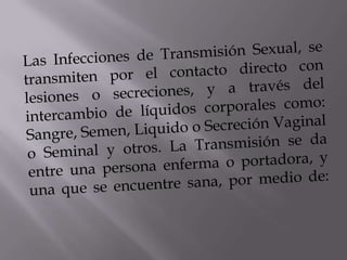 El documento habla sobre varias infecciones de transmisión sexual (ITS) como la clamidia, gonorrea, herpes, sífilis y VIH/SIDA. Explica cómo se transmiten estas ITS a través del contacto sexual sin protección o de madre a hijo durante el parto, y que algunas como la sífilis y gonorrea se pueden curar con antibióticos mientras que el VIH no tiene cura. También destaca la importancia de la prevención usando condones y lavándose después del contacto sexual.