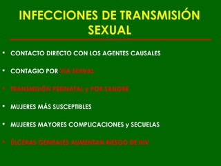 Este documento resume las principales infecciones de transmisión sexual (ITS), incluyendo bacterianas como gonorrea y clamidia, virales como herpes simple y VIH, y parasitarias. Describe los síntomas, complicaciones, diagnóstico y tratamiento de cada ITS. También explica la asociación entre el virus del papiloma humano (HPV) y cáncer cervical, y el rol del HPV como factor necesario para el desarrollo de cáncer cervical.