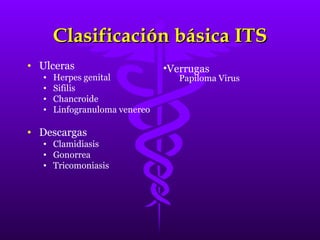El documento resume las principales infecciones de transmisión sexual, incluyendo el VIH/SIDA. Describe las causas, síntomas y formas de transmisión de enfermedades como la sífilis, clamidias, gonorrea, tricomoniasis, herpes genital y VPH. También explica brevemente la epidemiología del VIH/SIDA a nivel mundial y en el Perú, así como métodos para prevenir la transmisión sexual como el uso de condones y tratamientos antirretrovirales.
