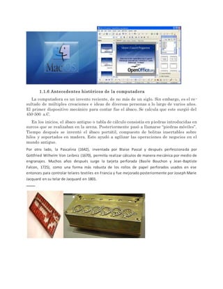El documento describe la evolución histórica de la computadora desde sus orígenes mecánicos hasta la era digital. Comienza con dispositivos como el ábaco y la máquina diferencial de Babbage. Luego describe las seis generaciones de computadoras desde las primeras basadas en válvulas hasta las actuales basadas en microprocesadores e internet. Finalmente, define conceptos clave como hardware, software, lenguajes de programación y sistemas operativos.