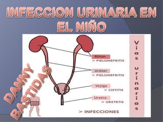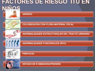 Este documento describe los factores de riesgo, signos y síntomas, diagnóstico y tratamiento de la infección del tracto urinario (ITU) en niños. Algunos factores de riesgo incluyen anomalías estructurales o funcionales del tracto urinario, prepucio anormal y estado inmunosupresor. Los signos y síntomas varían según la edad del niño e incluyen fiebre, dolor abdominal, vómitos y disuria. El diagnóstico definitivo requiere uroanálisis y uroc