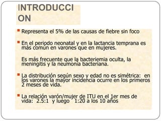 Este documento trata sobre las infecciones del tracto urinario (ITU) en pediatría. Resume que las ITU representan el 5% de las causas de fiebre sin foco en niños y son más comunes en varones que en mujeres en el periodo neonatal y de lactancia temprana. Los principales factores de riesgo incluyen ser niña, no estar circuncidado, anomalías congénitas y uso de sonda vesical. El diagnóstico puede ser difícil en lactantes debido a síntomas inespecíficos e inadecuación de las muestras.