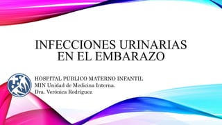 Este documento presenta información sobre las infecciones urinarias en el embarazo. Discuten las formas clínicas como bacteriuria asintomática, cistitis aguda y pielonefritis aguda. Detallan los criterios diagnósticos, esquemas de tratamiento antibiótico recomendados y complicaciones potenciales. También presentan estadísticas sobre casos de infección urinaria en embarazadas internadas en un hospital.