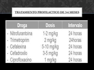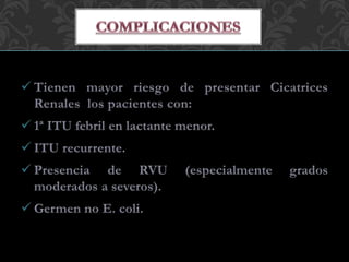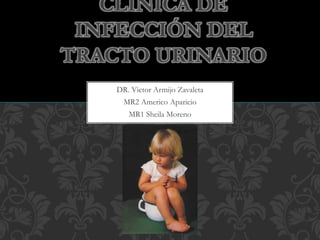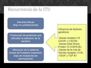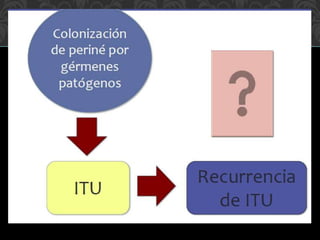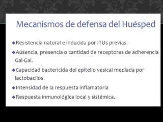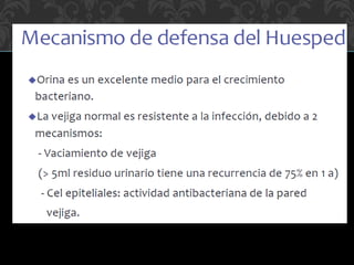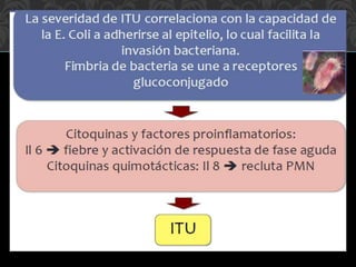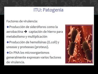 Este documento resume la definición, etiología, fisiopatología, factores de riesgo, cuadro clínico, exámenes auxiliares, diagnóstico, tratamiento y criterios de interconsulta de la infección del tracto urinario. Define la infección del tracto urinario como la presencia de bacterias en la orina que pueden afectar las vías urinarias altas o bajas. Los principales patógenos son Escherichia coli y Klebsiella. El tratamiento depende de si es una infe