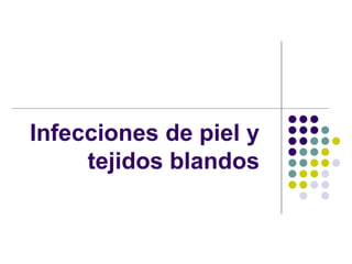 Este documento resume las principales infecciones de piel y tejidos blandos causadas por bacterias, hongos y virus. Describe la flora cutánea normal y los patógenos más comunes como Staphylococcus aureus, Streptococcus pyogenes, Candida spp. y Dermatophytes. Explica las características clínicas de infecciones como impétigo, erisipela, celulitis, gangrena gaseosa y candidiasis. Además, detalla los factores de virulencia y tratamiento de estas afecciones cutáneas.