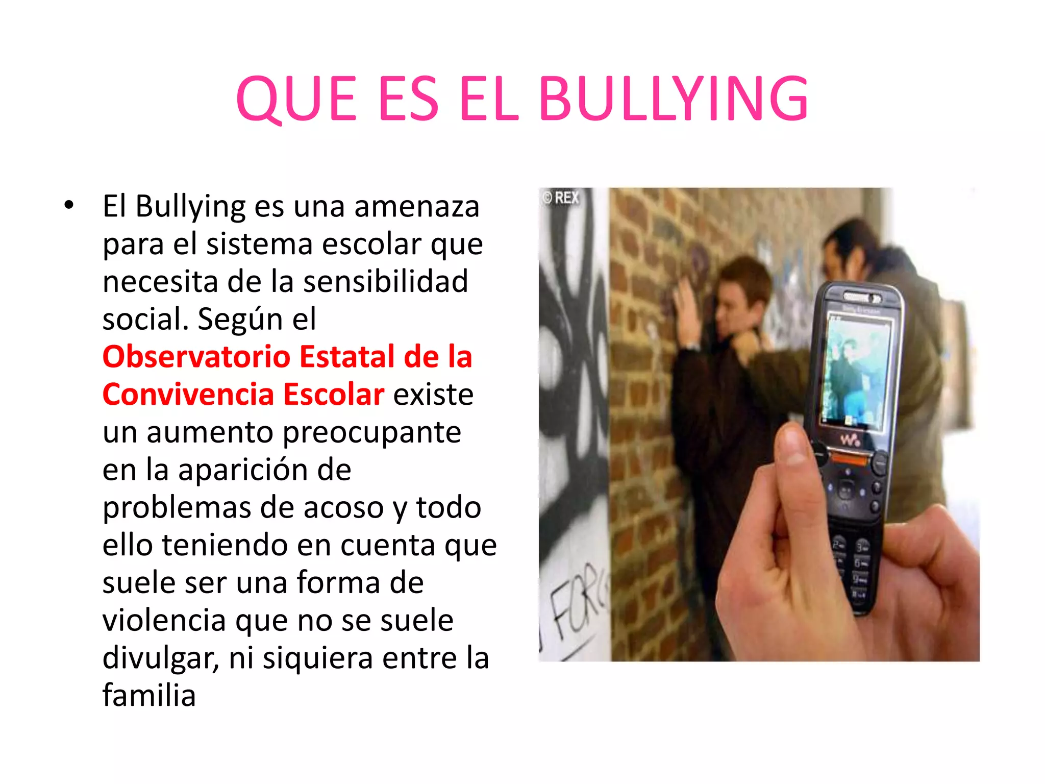 Este documento presenta información sobre el bullying y el ciberbullying. Define el bullying como una amenaza para el sistema escolar que incluye formas físicas, verbales y psicológicas de agresión. Explica que el ciberbullying ocurre a través de Internet y dispositivos electrónicos para avergonzar o acosar a otras personas. Identifica siete formas de ciberbullying como el envío de mensajes ofensivos, el acoso en línea, el ciberstalking, la suplantación de identidad, el outing y la exclusión.