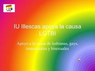 El documento aborda el apoyo a la causa LGTBI en temas como la lucha contra la LGTBIfobia, la despatologización de la transexualidad y la inclusión del colectivo LGTBI en políticas de empleo. Se critican declaraciones de figuras religiosas y políticas que se oponen a los derechos LGTBI, destacando la defensa de la familia tradicional y la oposición al matrimonio homosexual. Se celebra el reconocimiento de derechos para el colectivo LGTBI en Illescas.