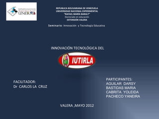 Este documento presenta información sobre el Instituto Universitario de Tecnología Industrial "Rodolfo Loero Arismendi" (IUTIRLA). El IUTIRLA ofrece programas de estudio en áreas como informática, diseño gráfico, administración industrial, y más. El IUTIRLA busca la excelencia académica para formar técnicos universitarios que satisfagan las necesidades del mercado laboral con bajos costos y alta calidad. El IUTIRLA tiene sedes en varias regiones de Venezuela.
