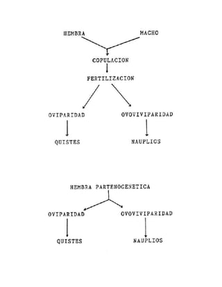 La Artemia salina es un crustáceo que se utiliza como alimento en acuicultura debido a su capacidad única de formar huevos resistentes llamados quistes. Los quistes pueden mantener su viabilidad durante años hasta que se dan las condiciones adecuadas para la eclosión. El cultivo de A. salina implica la obtención de quistes de zonas naturales o cultivos intensivos, su filtrado, lavado, secado y almacenamiento. La eclosión de los quistes ocurre óptimamente entre 25-30