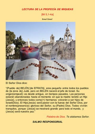 La profecía de Miqueas anuncia que el Mesías nacerá en Belén y será el pastor de Israel que traerá paz. El salmo responsorial pide a Dios que renueve a su pueblo y brille su presencia para salvarlos. La carta a los Hebreos contrasta los sacrificios de la antigua ley con el sacrificio único de Jesús en la cruz. El evangelio relata la visita de María a su prima Isabel, donde Juan salta de alegría en el vientre de su madre al oír la voz de María.