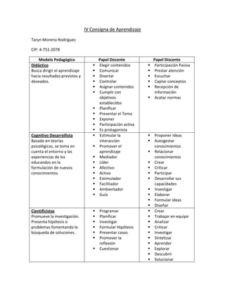 Este documento describe tres modelos pedagógicos y sus papeles docentes y discentes. El modelo didáctico busca dirigir el aprendizaje hacia resultados previstos mediante la planificación y presentación de contenidos por parte del docente, mientras que el discente cumple objetivos y recibe información. El modelo cognitivo desarrollista se basa en la psicología y considera las experiencias de los estudiantes, promoviendo la interacción, aprendizaje y desarrollo de capacidades por parte del discente. Finalmente, el modelo c