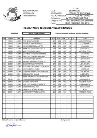 Este documento presenta los resultados de la competición de tiro con arco IV Trofeo Lluarcos que tuvo lugar el 13 de febrero de 2010. Dividió a los participantes en tres divisiones según el tipo de arco utilizado y proporcionó la clasificación de cada división con el nombre y puntuación de los arqueros. Juan Jesus Alonso Lopez quedó en primer lugar en la división de arco recurvo y Jose Jerez Lorenzo en la división de arco compuesto.