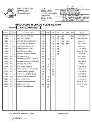 Este documento presenta los resultados técnicos y clasificaciones de tres divisiones (arco recurvo, arco compuesto y arco tradicional) en el IV Trofeo Lluarcos de tiro con arco celebrado el 13 de febrero de 2010. Lista los nombres y puntuaciones de los participantes de cada división, así como su clasificación previa y final.