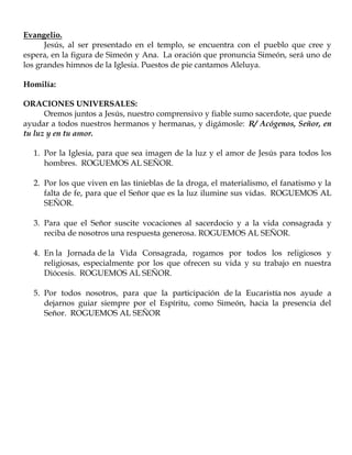 Este documento es la liturgia de la parroquia Nuestra Señora de la Merced para el cuarto domingo del tiempo ordinario. Se da la bienvenida a los feligreses y se recuerda cómo Simeón y Ana reconocieron a Jesús como el Mesías en el templo. La homilía explora este encuentro y las lecturas. Se incluyen oraciones universales para la Iglesia, los que viven sin fe, las vocaciones, los religiosos y para que los feligreses sigan guiados por el Espíritu Santo como Simeón.