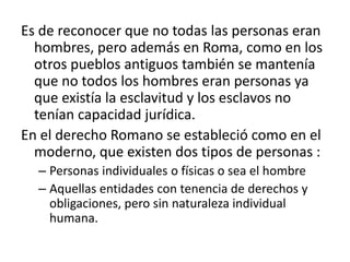 1) En el derecho romano, para ser considerado una persona no bastaba con ser un hombre libre, también se requería ser ciudadano romano y jefe de familia.