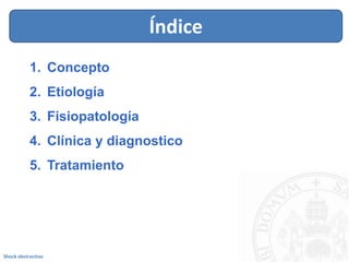 El shock obstructivo es un déficit de llenado cardíaco causado por compresión de estructuras cercanas, a pesar de que el corazón esté normal. Sus etiologías incluyen causas cardíacas como el taponamiento y causas extracardíacas como el tromboembolismo pulmonar. El tratamiento varía según la causa, incluyendo pericardiocentesis para el taponamiento y drenaje pleural para neumotórax.