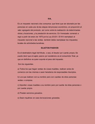 Este documento resume los aspectos fundamentales del Impuesto al Valor Agregado (IVA) en Venezuela. Explica que el IVA es un impuesto nacional sobre los consumos que se aplica en cada etapa del proceso económico. Identifica a los sujetos pasivos del impuesto y describe los hechos gravados, así como las exenciones y exoneraciones previstas por la ley. Además, especifica que el IVA se aplica en el territorio venezolano y que la alícuota general se fija anualmente entre el 8% y 16.5%. Por último, indica