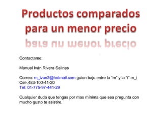 El documento proporciona los datos de contacto de Manuel Iván Rivera Salinas para consultas sobre la compra de portátiles, incluyendo su correo electrónico, número de celular y teléfono. También presenta las especificaciones y precios de varios modelos de portátiles disponibles con diferentes sistemas operativos y configuraciones de hardware.