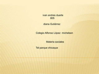 El documento proporciona información sobre la ubicación y cómo llegar al Parque Chicaque desde Bogotá y otras ciudades cercanas. Explica que Chicaque está a 30 minutos de Bogotá y se puede llegar en transporte público o vehículo particular desde Bogotá, Mosquera, Soacha o La Mesa. Describe varias rutas y medios de transporte para llegar al parque desde diferentes lugares.