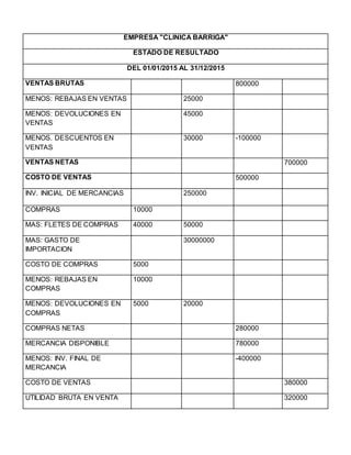La clínica Barriga tuvo ventas netas de $700,000 con un costo de ventas de $500,000, resultando en una utilidad bruta de $320,000. Los gastos de operación, incluyendo gastos de ventas de $130,000 y gastos administrativos de $70,000, sumaron $200,000. La utilidad neta del período fue de $120,000.